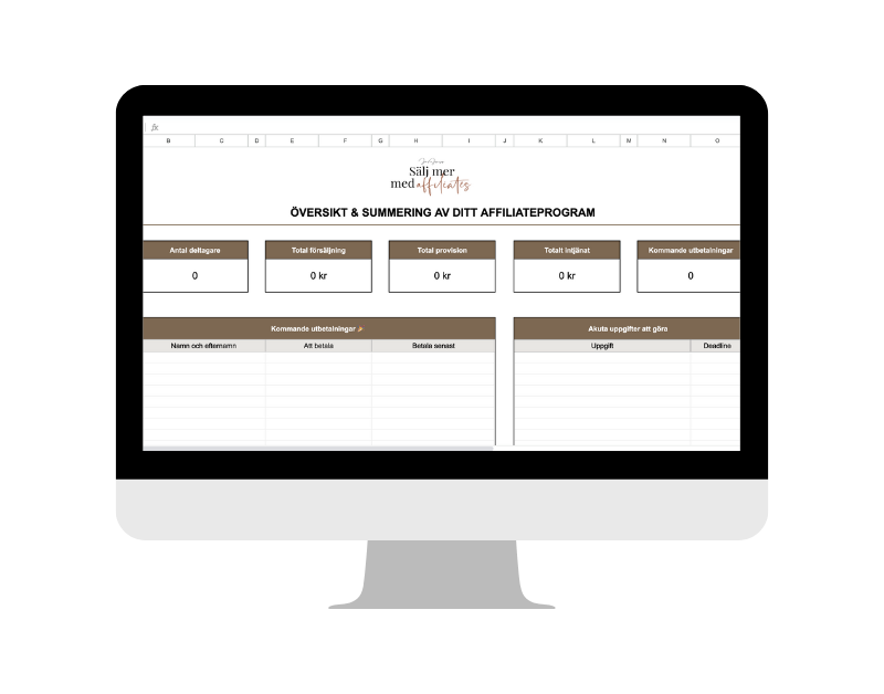Få full koll på alla dina affiliates, utbetalningar och status på ett ställe. I den här bonusen får du en färdig Google-mall där du enkelt kan hålla koll på dina affiliates, se deras försäljning och markera vad som är utbetalt - så att du får total kontroll från dag ett.